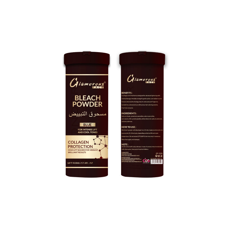 Glamorous Face Bleach Powder Blue is formulated with Collagen Protection to maintain hair strength during lightening. Specially designed for an intense lift while neutralizing yellow and brassy undertones, it helps achieve cool, bright, and clean tones. The creamy texture ensures easy mixing and smooth application for professional, salon-quality results with reduced damage.